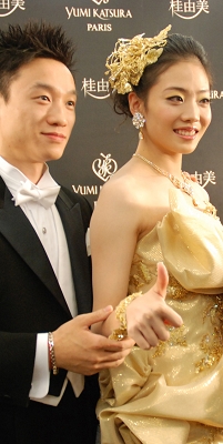 這件由桂由美打造的價值3000萬元的黃金婚紗,是婚紗界的頂級藝術(shù)品。全世界僅有兩件,另外一件已經(jīng)被日本國立博物館收藏。完成造型,穿上婚紗,當(dāng)兩人手挽手出現(xiàn)在大堂時,無數(shù)閃光燈頓時閃起。此時的楊威有些緊張,抿著嘴擠出一絲笑容,倒是楊云顯得自然很多,一手拿著紅色禮花,大方地向鏡頭露出迷人的微笑。過了10分鐘,楊威才從緊張的情緒中舒緩過來,左手搭在楊云的肩上,兩人一起擺著POSE。