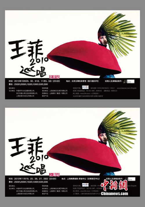 中新網7月10日電 據香港明報報道,已5年沒開演唱會的王菲鐵定于北京及上海舉行10場《王菲2010巡唱》。演唱會海報9日率先曝光,而主辦機構也公布門票售價。雖最貴門票每張索價2500人民幣,但北京站預售10分鐘已迅即爆滿,反應熱烈﹗