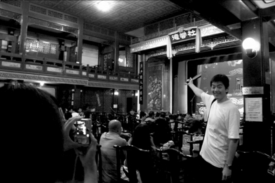 晚上7點(diǎn)半,演出正式開始,德云社元老邢文昭先生表演單口相聲《文昭關(guān)》。此時上座率剛剛過半,觀眾都很安靜地聽相聲,邢先生抖包袱后,大家也是試探著“噫”了幾聲,反倒是邢先生挺放得開,“叫好就痛快點(diǎn)”。德云社門前停著于謙的座駕,但在后臺,記者沒有看到他和郭德綱的身影。