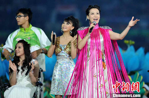 中新網(wǎng)12月13日電 與在海心沙舉辦的亞運(yùn)會開幕式上強(qiáng)烈的視覺沖力和明星云集不同,12日晚在廣東奧林匹克體育中心上演的亞殘運(yùn)會開幕式則充滿了溫暖和關(guān)愛。文藝表演環(huán)節(jié)中,除了400多位殘疾人媽媽團(tuán)和300多個殘疾演員用手語帶領(lǐng)6萬名觀眾進(jìn)行愛的表達(dá)震撼全場之外,一位特殊的明星創(chuàng)紀(jì)錄的三次出場給觀眾帶來了不同的驚喜和感動,她就是著名歌唱家、廣州亞運(yùn)會宣傳大使——譚晶。