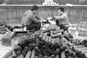 旁邊兩個工人正在給一些“竹簡”上色做舊,他們說龍帝也將像秦始皇一樣:“焚書坑儒”!旁邊的書簡已經(jīng)制作了一大堆,雖然僅僅是要燒掉的書簡,但制作非常精良,外層用竹片,里層全是圓形實木。