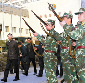 繼在北京舉行了盛大的首映禮之后,《集結(jié)號(hào)》主創(chuàng)一行十多人又馬不停蹄地來(lái)到上海展開宣傳活動(dòng)。19日下午,新聞發(fā)布會(huì)選擇在上海電影集團(tuán)5號(hào)攝影棚進(jìn)行。在馮小剛帶領(lǐng)“谷子地”張涵予、廖凡、王寶強(qiáng)、任泉、袁文康、李乃文等主創(chuàng)入場(chǎng)時(shí),武警戰(zhàn)士還鳴槍歡迎。整個(gè)發(fā)布會(huì)現(xiàn)場(chǎng)也布置成了片中硝煙彌漫的“戰(zhàn)場(chǎng)”,有沙袋、機(jī)槍、戰(zhàn)壕等。發(fā)布會(huì)后男主創(chuàng)們還乘敞篷吉普車和軍用卡車前往首映的電影院。