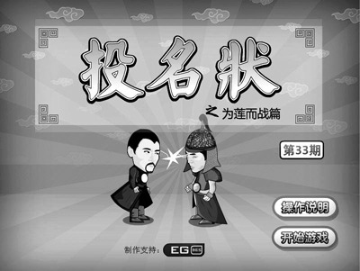 而互動(dòng)惡搞《投名狀》的游戲也很有趣,就是趙二虎發(fā)現(xiàn)自己夫人蓮生和龐青云有染,為了挽回男人的尊嚴(yán),他只有靠武力來(lái)證明自己是最強(qiáng)的,請(qǐng)參與游戲者幫趙二虎來(lái)挑戰(zhàn)龐青云。而游戲規(guī)則就是使用控制鍵,控制趙二虎挑戰(zhàn)龐青云,在規(guī)定時(shí)間內(nèi)打敗龐青云即告勝利。在熟悉了游戲規(guī)則之后,此類惡搞并無(wú)難度系數(shù)。勝者王敗者寇,如果輸了,趙二虎會(huì)慚愧跪地說(shuō):“為什么我會(huì)輸?我才是元配!倍嬊嘣苿t會(huì)摟著蓮生說(shuō):“我是唯一的選擇,請(qǐng)支持壹基金!苯Y(jié)果令人忍俊不禁。