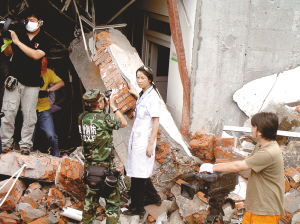 昨日,在德陽市第六人民醫(yī)院住院部的廢墟中,蔣雯麗蹲在一片廢墟之中,身上、臉上全是泥灰,導(dǎo)演一喊開始,蔣雯麗用雙手在鋼筋瓦礫的廢墟中扒找自己的同事和醫(yī)藥箱。拍攝現(xiàn)場,混凝土板塊還懸在半空中,搖搖欲墜。拍攝中,蔣雯麗還被擦傷。