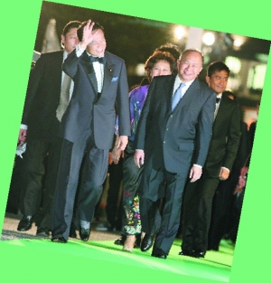 前日,導(dǎo)演吳宇森率領(lǐng)梁朝偉、金城武、張震、林志玲、趙薇、張豐毅等群星,浩浩蕩蕩出席第21屆東京國際電影節(jié)揭幕禮。大會將星光大道的紅地毯改為綠地毯,又以最新的環(huán)保汽車接載嘉賓,以配合大會的環(huán)保主題。9月底才剛上任的日本首相麻生太郎,專程與導(dǎo)演吳宇森一起走上星光大道的綠地毯,一路上似乎言談甚歡。麻生太郎是首位出席東京電影節(jié)的日本首相,還非常捧場地觀看了電影《赤壁》。除吳宇森外,一眾《赤壁》演員中只有梁朝偉與金城武有幸與麻生首相合照。