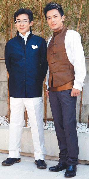 “海角七號(hào)”導(dǎo)演魏德圣(左)與男主角范逸臣為金馬試裝。