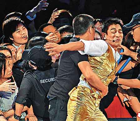 中新網(wǎng)12月25日電 劉德華前晚在紅館演出第三場(chǎng)演唱會(huì),繼續(xù)以好歌會(huì)知音,但出現(xiàn)輕微聲沙情況,他見(jiàn)臺(tái)下歌迷都熱情狂叫,擔(dān)心大家會(huì)一齊失聲。有歌迷親近偶像心切,差點(diǎn)把華仔拉下臺(tái),幸好保安人員上前解圍。
