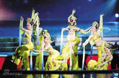 在今年春晚上,舞蹈《飛天》引人關(guān)注:七名仙女打扮的舞蹈演員站在升降舞臺(tái)上,用肢體配合音樂演繹出敦煌壁畫中的飛天形象,配合著舞臺(tái)上飄落的花瓣和臺(tái)下噴涌而出的水花,一起將觀眾引入“仙境”。