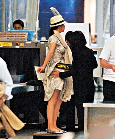 劉嘉玲和梁朝偉昨日凌晨由曼谷機場轉(zhuǎn)飛不丹,臨上機前二人如普通旅客一般,要經(jīng)過金屬探測機測試,未料嘉玲過關(guān)時竟發(fā)出BB聲響,女關(guān)員即上前一手拿 金屬探測儀器,一手摸嘉玲腰胸搜身,而嘉玲非常合作,自動脫掉帽子,挺直腰板任由女關(guān)員檢查,最后安然過關(guān)開心上機。