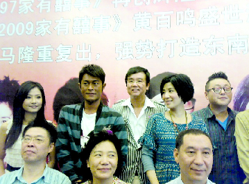 昨日下午杭州雨后天晴,如香港東方電影公司老總黃百鳴的心情,因?yàn)椤都矣邢彩隆废盗须娪霸陂焺e銀幕11年之后,終于有機(jī)會(huì)制造《家有喜事2009》。昨天該片在杭州舉行了開機(jī)新聞發(fā)布會(huì),主演吳君如、古天樂、黃百鳴、鄭中基、姚晨、郭濤等等一干明星全體出席。