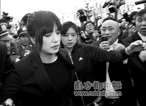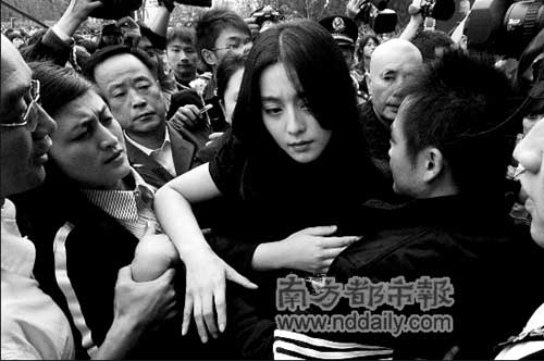 來為恩師送行的范冰冰、趙薇就沒有那么幸運。據(jù)說,兩人原本打算從正門進入,卻接到提前到達的電影局副局長江平的電話,安排兩人改從地下停車場或者側(cè)門進入。等范冰冰到了側(cè)門,發(fā)現(xiàn)人比正門還多,只好又繞到正門進入。有記者撰文稱:“范冰冰先是被人群沖散,不得已而走了正門,沖過重重人群進入大廳,她的臉被擠得幾乎變形,表情也極度痛苦。經(jīng)紀人和司機為了保護她,差點和圍觀的拍照者打了起來,范冰冰見狀忙大叫,‘不要打了!’”