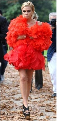 點(diǎn)評:維多利亞火紅羽毛裝再次登上十厘米以上的恨天高,兩只圓規(guī)似的細(xì)腿讓短裙更加MINI,可以去扮演美國兒童們最愛的芝麻街里憨態(tài)可掬的大鳥先生了。