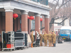 除了道具和布景以外,另一邊演員和造型師也忙得不可開交,記者在現(xiàn)場看到,造型師正一遍又一遍地檢查著各位演員的服飾和妝容,并且還要對每一雙鞋進行做舊處理,以達到最佳拍攝效果。當看到幾位群眾演員的軍裝領(lǐng)口,露出不符合時代背景的內(nèi)衣后,就立刻要求他們脫下。記者看到,就連每一位群演的化妝也都細致入微,有的因為要調(diào)整膚色將粉底涂至脖子根部,有的被化妝師在臉上做出了好似疤痕的效果,更有甚者,因為發(fā)型不符合電影故事發(fā)生年代,竟被發(fā)型師當場剃成“板寸”。記者在現(xiàn)場還看到幾位候場的日本演員,敬業(yè)的他們在開拍前很久便開始對著鏡子反復練習。