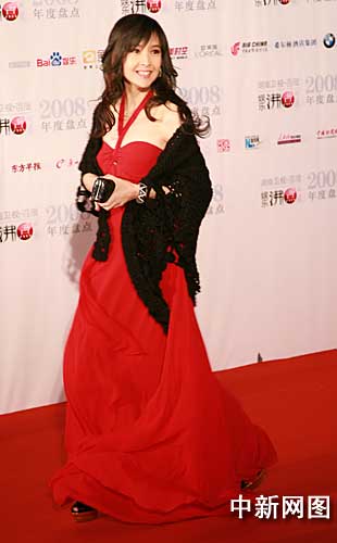 中新網(wǎng)2月19日電 2009年初嫁給倪震的女星周慧敏,今日在國家游泳中心水立方以一襲鮮紅的低胸紗裙配黑色披肩,亮相第二屆湖南衛(wèi)視•百度娛樂沸點2008年度盤點典禮紅地毯。這是她婚后首次亮相內(nèi)地公開活動。