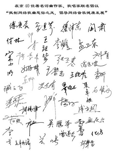 中國音樂家協(xié)會(huì)19日在京召開“抵制網(wǎng)絡(luò)歌曲惡俗之風(fēng)”座談會(huì),與會(huì)代表痛批了以《那一夜》、《大連站》、《狼愛上羊》等為代表的網(wǎng)絡(luò)歌曲低俗化現(xiàn)象,同時(shí),以閻肅等為代表的在京40位著名詞曲作家、歌唱家聯(lián)名發(fā)起了“抵制網(wǎng)絡(luò)歌曲惡俗之風(fēng),倡導(dǎo)網(wǎng)絡(luò)音樂健康發(fā)展”倡議書。