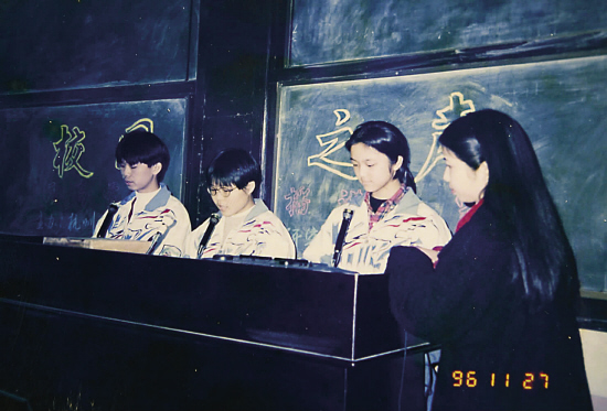 湯唯是班長(zhǎng),又是語(yǔ)文課代表,藝術(shù)天賦很早就表現(xiàn)出來(lái)了。1996年11月27日,湯唯與另外兩名同學(xué)代表學(xué)校參加校園之聲職高學(xué)生播音比賽,還獲了獎(jiǎng)。“她很喜歡各種文藝方面的活動(dòng),每次的主題班會(huì)都是湯唯與副班長(zhǎng)一起主持策劃的!闭f(shuō)到這班主任肖老師很開(kāi)心,“只要有她在,我什么都不用操心,只要坐在底下聽(tīng)就好。她是個(gè)很用功的學(xué)生。湯唯普通話說(shuō)得很好,學(xué)校的活動(dòng)很多都是她主持的。”