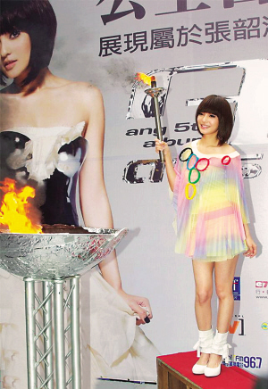 張韶涵將于12月14日推出第五張大碟《ANG 5.0》,前日,福茂唱片斥資12.5萬人民幣為她的簽唱會(huì)打造“移動(dòng)式競(jìng)技場(chǎng)”舞臺(tái),讓簽唱會(huì)走到哪里,競(jìng)技場(chǎng)舞臺(tái)就原封不動(dòng)地移動(dòng)到哪。當(dāng)日,張韶涵身穿象征“奧運(yùn)運(yùn)動(dòng)家精神”的露肩五彩透明薄紗春裝“彩虹運(yùn)動(dòng)裝”現(xiàn)身,還從舞者手上拿起圣火火炬,點(diǎn)燃象征出征必勝的圣火塔。