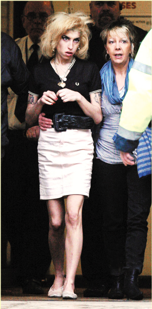 美國有“癲后”布蘭妮長期霸占娛樂版面,英國則有“毒后”艾米·懷恩豪斯制造新聞點。上周五她在審訊結(jié)束前5分鐘趕到法庭,為被控傷人及行賄等罪名的25歲老公Blake打氣,還公然于庭上高喊:“老公我愛你!你是最靚仔有型的!”送給Blake一顆定心丸,有目擊者就表示,Blake隨即以口形回應(yīng):“你怎樣啦?”艾米只懂不斷重復(fù):“愛你!愛你!”恩愛得旁若無人。不過艾米當天邋遢異常,蓬頭垢面甚至穿著殘舊芭蕾舞鞋就來到法庭了。