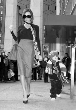 11日,美國紐約,辣妹維多利亞帶著兒子克魯茲上街購物,卻險被兒子搶去了風頭。