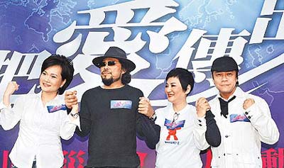 沈春華(左起)、張菲、張小燕和蔡康永為災(zāi)民加油。