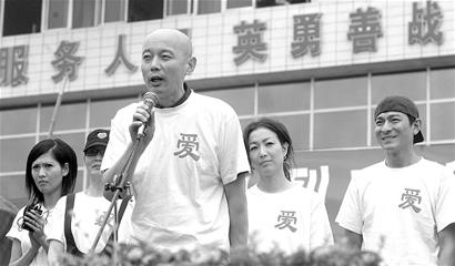 作為活動(dòng)的發(fā)起人——四川女婿張國(guó)立用四川話鼓勵(lì)大家:“大家辛苦了!地震雖然摧毀了我們的家園,我們可以建設(shè)更好的家園,天災(zāi)雖然無情,但是我們?nèi)硕加星椤N覀円黄鸷八拇佑!四川雄起哈!”現(xiàn)場(chǎng)每一個(gè)人都高舉右手,高呼:“四川加油!四川雄起!” 記者馬丹 攝影劉亮
