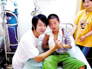 日前林俊杰推卻一切宣傳工作,專程飛抵成都兒童醫(yī)院探望災區(qū)重病兒童,并送上禮物給孩子們。在醫(yī)院的ICU病房,林俊杰(見左圖,與受傷小朋友在一起)看望了傷勢較重的王敏和李斯隱,正巧兩人都是林俊杰的超級粉絲。王敏向偶像提出了自己的兒童節(jié)禮物,“能不能為我唱一首《期待愛》?”她靦腆地問道。林俊杰當即滿足了孩子的要求,輕聲地唱了起來,病房里頓時充滿了喜悅,受傷的王敏露出了災難后的第一次笑容,接下來的病房也變成了小型演唱會的現場,林俊杰與孩子們合唱了很多歌曲。林俊杰表示,希望用自己捐獻的善款建一所希望小學。