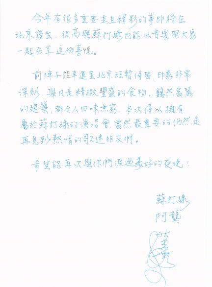 中新網(wǎng)6月10日電 隨著6月15日“陪我唱歌”蘇打綠北京演唱會(huì)的日益臨近,全國的歌迷翹首以待臺灣第一樂團(tuán)蘇打綠的到來,演唱會(huì)的門票的銷售情況也是非常的火爆。近日,遠(yuǎn)在臺灣的蘇打綠樂團(tuán),親自手寫信函來表達(dá)對歌迷此次演唱會(huì)的支持與厚愛,同時(shí)也表達(dá)對此次北京之行的急切與喜悅之情。