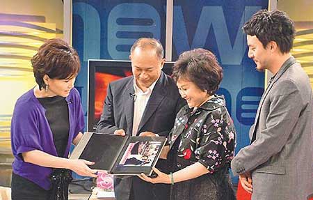 沈春華(左起)昨送吳宇森與牛春龍夫婦一本集合世界各景點的相簿。