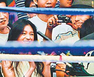 當晚,與大S一起的還有黑人、范瑋琪等。大S和吳建豪坐隔壁,大S不時鼓掌叫好,并高舉雙手加油,吳建豪則拿相機拍照,還看得瞠目結(jié)舌。比賽結(jié)束,大S趴在擂臺邊,望著臺上的壯漢,要吳建豪幫她和猛男合照,2人和拳手握手后,才心滿意足并肩離去。