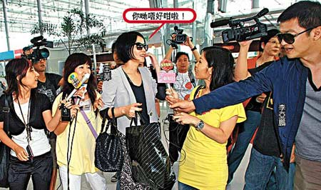 帶備多箱酒送給嘉玲的李亞鵬,與王菲及靖童于昨晨10時(shí)半左右出現(xiàn)曼谷機(jī)場,隨即引起大混亂,10多名記者及3間電視臺攝制隊(duì)將王菲重重包圍,又將麥克風(fēng)遞向王菲她講兩句,她卻說:“我趕時(shí)間了!”