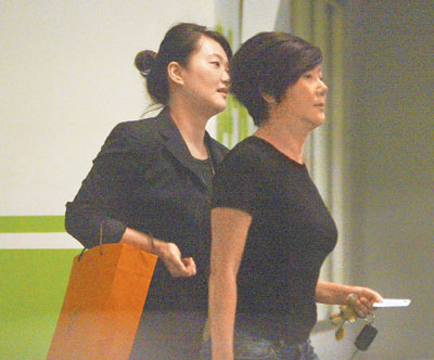 藍心湄(右)取車時有專人負責提袋,側面觀察她小腹凸出。
