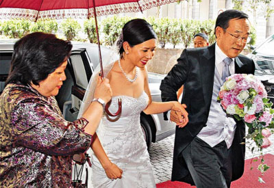 中新網(wǎng)8月13日電 現(xiàn)年41歲的羅慧娟(娟妹)昨日與57歲新加坡籍金融才俊劉志敏結(jié)束10年愛情長跑,手牽手步入教堂成婚。新郎宣誓時(shí)既緊張又感動,冒汗又流淚,新娘子貼心為他拭抹之余,也忍不住流下熱淚,場面感動。一直有順其自然造人計(jì)劃的娟妹,昨日穿上貼身婚紗時(shí)腹部微隆,不禁令人猜想她雙喜臨門。