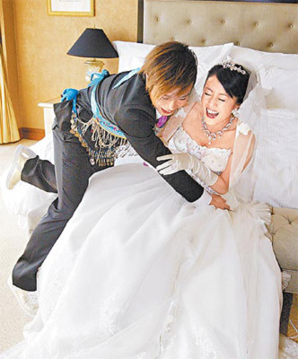 據(jù)臺灣媒體報道,彈頭與皮皮交往半年就閃電步入禮堂,外傳是奉子成婚,昨晚新娘穿著馬甲式白紗、腳踩高跟鞋性感亮相,刻意“藏”住孕味。他們昨一早在飯店總統(tǒng)套房進行迎娶,彈頭為見到新娘一面,必須過3關(guān),包括通過“老漢推車”、“火車便當”等體能測驗,同時吃下他最怕的海參沾黃連,再涂口紅蓋唇印,對新娘說愛的宣言。拜別父母時,新郎卻哭得比新娘還慘。