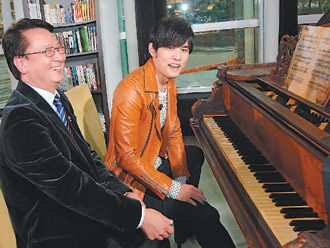 周杰倫(右)現(xiàn)場用鋼琴表演創(chuàng)作,令主持人李四端十分佩服。