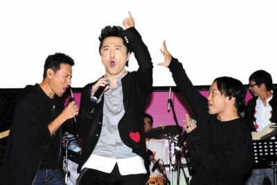 在昨日的發(fā)片會上,張學(xué)友和陳奕迅新老兩歌神不僅到場助陣,還帶來了庾澄慶最喜歡吃的巧克力和薯片,寓意他在香港“吃得開”。三人特別合唱了《愛你的只有一個我》、Rap版《愛是懷疑》以及搖滾版《吻別》。開唱前張學(xué)友打趣說:“情緒好點了嗎?”陳奕迅還特別提醒在座媒體“留心歌詞”。由于三人的表演非常精彩,有記者發(fā)問,庾澄慶是否考慮與張學(xué)友和陳奕迅組成一個類似“縱貫線”的樂隊,庾澄慶說:“你剛才看到的表演我們才排練了十分鐘,每一次他們都覺得哪里加一個和音會比較有亮點,在他們百忙之下一共合作了三次。我覺得我們?nèi)齻首先應(yīng)該有作品,因為學(xué)友馬上就有專輯出來,Eason也正在錄音,把三個人放在一起表演有困難,如何協(xié)調(diào)才是真的,所以先有歌會比較好。我們?nèi)齻中,學(xué)友比較煽情,我比較搖滾,陳奕迅的發(fā)揮很即興,寫這首歌的人不一定是我,但是寫的人一定會很過癮。如果市場反應(yīng)不錯的話,可以跟‘貫縱線’拼一下!