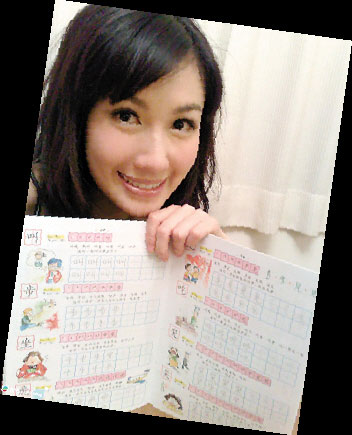 李詩韻從小就在加拿大讀書,雖然回香港做了5年的演藝工作,已經(jīng)能看懂70%的中文,但是會寫的漢字不足200個,平時寫博客也需要麻煩同事幫忙。從她博客上的圖片可以看到,練習冊上歪歪斜斜地寫著“門”、“房”、“橋”等字,目前只相當于一年級學生的水平。
