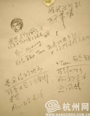 和所有的新聞發(fā)布會一樣,劉謙的新聞發(fā)布會也有冗長的各贊助商發(fā)言時間。從臺下看,劉謙在贊助商發(fā)言時間一直很認真地在記筆記,而事實上,他和每一個在無聊會議上的人一樣,認真地在紙上亂涂亂畫:一個小小的自畫頭像,幾行無意義的漢字,還有一處寫著“No money”,就是這位魔術師的會議筆記。