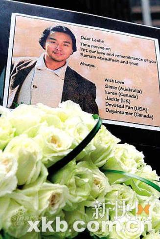 張國榮(哥哥)的歌迷昨天在香港文華東方酒店外舉行悼念活動,紀念哥哥去世六周年。事發(fā)地擺滿歌迷自發(fā)送來的各式鮮花。3月31日上午11時開始,便有歌迷從上海、臺北,日本、美加、英國、澳大利亞等地趕到文華東方酒店向偶像悼念,并送上心形花牌給哥哥。