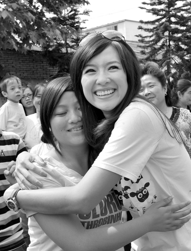 這時(shí),一個(gè)孩子擠近章子怡身邊。章子怡問道:“小朋友,你叫什么名字?”旁邊的吳院長(zhǎng)立即說(shuō):“子怡,這孩子有先天性聾啞,耳朵聽不見!闭伦逾p眼閃出一絲淚花,她伸出雙手立即將孩子緊緊擁抱。之后,她拿出了精美的筆記簿禮物,一一送到孩子們手上。