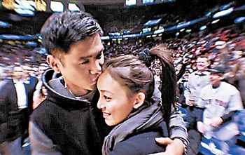 今年春節(jié),陳建州與女友范瑋琪選擇在紐約共度,同時受好友易建聯(lián)之邀,兩人去新澤西觀看北京時間2月18日上午進(jìn)行的籃網(wǎng)與熱火的比賽。中場休息時,“黑人”陳建州突然起身,掏出一枚鉆戒向女友求婚,范瑋琪含淚答應(yīng),兩人結(jié)束十年愛情長跑。陳建州多年來一直想“伺機”求婚,但一直太緊張而未敢有“妄為”。這次,非常喜歡籃球的他認(rèn)為籃網(wǎng)主場是一個好機會,于是大膽表白;@球場邊的美國人看到這一幕,也跟著一起歡呼叫好,并不停地喊著“易”,呼喚易建聯(lián)參加好朋友的求婚“儀式”。靦腆的阿聯(lián)一邊微笑,一邊鼓掌,見證這對好友的幸福時刻。