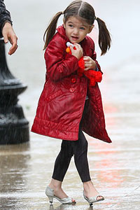 凱蒂•赫爾姆斯(Katie Holmes)與蘇瑞(Suri Cruise)11月份到波士頓陪湯姆克魯斯(Tom Cruise)時(shí),被媒體拍到她帶著小蘇瑞逛街血拼。3歲的蘇瑞雖然手里抱著洋娃娃,但腳踩銀灰色高跟鞋,一副早熟的“小大人”模樣。