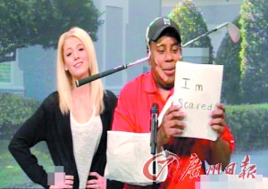 在一則小品中,布雷克裝扮成“虎嫂”艾琳,逼著搭檔基南·湯普森扮演的伍茲公開道歉,后者拿著印有“老婆太厲害了,我錯(cuò)了,我害怕極了”之類字眼的紙板不停道歉,令人忍俊不禁。