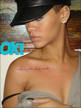 美國歌壇數(shù)一數(shù)二的潮流小天后蕾哈娜在自曝自己的手槍紋身后,再度在自己的博客中登出了全新的紋身。“Never A Failure, Always A Lesson”這就是這位小天后在自己的鎖骨處的新紋身上面的一句話?不知道蕾哈娜想要告訴我們什么呢?