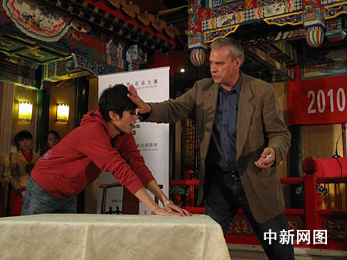 中新網(wǎng)11月25日電 昨天(24日),北京電視臺2010年“環(huán)球春晚”正式簽約美國著名魔術(shù)師大衛(wèi).威廉姆森儀式在北京全聚德烤鴨店舉行。和因春晚一炮而紅的劉謙一樣,來自美國的大衛(wèi)最擅長近臺魔術(shù),被譽(yù)為是“魔術(shù)盛典靈魂人物”。在簽約儀式上,大衛(wèi)以他風(fēng)趣幽默的個(gè)人風(fēng)格和在場的魔術(shù)愛好者過招,在觀眾眼前近距離地用撲克牌和順手拿起的筷子展示了自己嫻熟的手法。