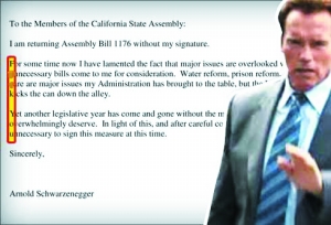 湯姆·阿米阿諾與幾位議員提出了一項(xiàng)法案,希望加州能在舊金山地區(qū)創(chuàng)建基礎(chǔ)設(shè)施融資區(qū),采取融資計(jì)劃推動(dòng)這些地區(qū)的基礎(chǔ)設(shè)施建設(shè)。通常此類法案如果不是問(wèn)題太多的話,州長(zhǎng)會(huì)予以批準(zhǔn)。但湯姆·阿米阿諾與施瓦辛格素來(lái)看不對(duì)眼,本月初又在集會(huì)上批評(píng)施瓦辛格的施政方式,還大罵他是“騙子”。施瓦辛格否決了這項(xiàng)提案,并在否決信上以藏頭詩(shī)的形式對(duì)阿米阿諾議員予以反擊,即信件每行第一個(gè)字母連起來(lái)就是“T(Tom),I f k you,A(Arnold Schwarzenegger)”。州長(zhǎng)辦公室新聞發(fā)言人稱此事純屬巧合,“試想每天寫那么多否決信,這種巧合的出現(xiàn)是遲早的事!