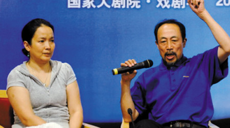 最激動的是飾演主角“培爾”的孫海英,打扮隨意的他剛拿起話筒時語調(diào)十分平靜,還被一旁的老伴呂麗萍調(diào)侃“說話像領(lǐng)導(dǎo)”。但談到演《培爾·金特》的感受,他的語調(diào)頓時激動起來,更大嘆“話劇已死”:“現(xiàn)在的戲劇都是在作假,互相說假話。人們都太浮躁,明明看不懂我們這部戲,只是看個熱鬧,到半場就回家了,還愣說看得懂———你明白個屁呀!什么都不明白!藝術(shù)不是因為你懂才來的,是因為不懂才來的,看不懂你就得學(xué)!我們不需要迎合大眾,你愛來不來!