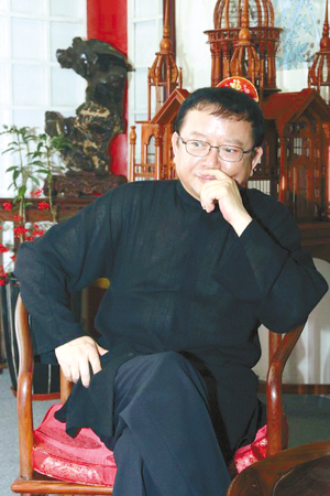 記者問王剛收藏品占他全部家產(chǎn)的多少,沒想到王剛停頓一下后回答:“百分之七十吧。我家除了一件沙發(fā),全部是古董!闭f到古家具,王剛興致很高,“我睡的那張雕花架子床有180年歷史。屋里還有一張羅漢床,三面有圍擋,沒想到是為兒子買的。兒子不會(huì)走路時(shí)在上面玩最安全。圍擋上還刻著房子、樹木等浮雕,兒子特喜歡!