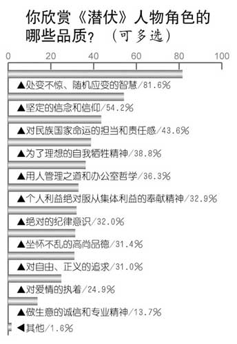觀眾欣賞《潛伏》中人物的哪些品質(zhì)?調(diào)查中81.6%的人首推“處變不驚、隨機(jī)應(yīng)變的智慧”,54.2%的人選擇“堅(jiān)定的信念和信仰”,43.6%的人選擇了“對民族國家命運(yùn)的擔(dān)當(dāng)和責(zé)任感”,接下來依次為:“為了理想的自我犧牲精神”(38.8%),“用人管理之道和辦公室哲學(xué)”(36.3%),“個(gè)人利益絕對服從集體利益的奉獻(xiàn)精神”(32.9%),“絕對的紀(jì)律意識(shí)”(32.0%),“坐懷不亂的高尚品德”(31.4%),“對自由、正義的追求”(31.0%),“對愛情的執(zhí)著”(24.9%),“做生意的誠信和專業(yè)精神”(13.7%)。