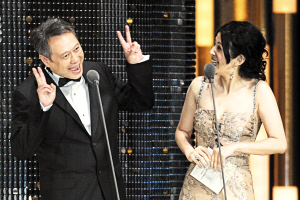 十二月八日晚,第四十四屆金馬獎(jiǎng)?lì)C獎(jiǎng)典禮在臺(tái)北小巨蛋舉行。李安獲得最佳導(dǎo)演獎(jiǎng),右為奪得新人獎(jiǎng)的湯唯。 中新社發(fā) 董會(huì)峰 攝