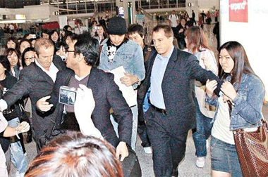 據(jù)香港太陽報(bào)報(bào)道,前晚十時(shí)半許,頭戴毛線帽的Rain背著LV袋,在數(shù)名工作人員的陪同下,現(xiàn)身香港機(jī)場,引來近百Fans送機(jī)。現(xiàn)場雖沒有保安員,但Fans為免耽誤他的時(shí)間,非常有秩序地為他開路。